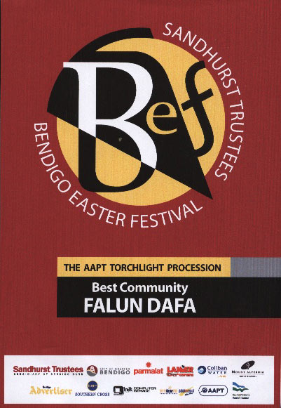 【明慧网2003年5月6日】墨尔本法轮功学员在今年墨尔本北部著名淘金城及旅游城班迪沟(Bendigo)的复活节“黄金的过去,金色的未来”(Golden Past, Golden Future)庆典中以出色的表现分别获得“最佳社团奖(Best Community)”及“最佳主题表现奖(Best Depiction of the Theme)”。庆典组委会向法轮功学员致信感谢,并将学员游行的录像资料珍重地收入班迪沟市的文档资料之中,作为对外推介班的资料之一。