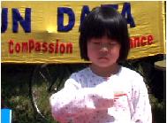 这次市场日的主题是“儿童--我们国家的脉搏”。很多孩子也跟随他们的父母来参加活动。一名四岁的小弟子打坐炼功,她宁静纯真的神态吸引了许多人驻足观看。