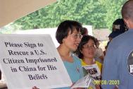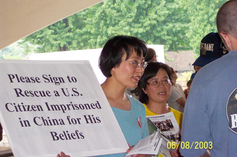 一个看起来是三代人的五口之家走过来了。学员问,“你们听说过法轮功吗?” 他们表示听说过,同时关心地问道,“好象还有个博士的太太因炼法轮功而被关押了?她怎么样了?” 学员解释说,“那是徐才录博士的妻子,她已经被放出来了。” “是吗?那太好了。”当他们明白我们这次是为营救另一位法轮功学员美国公民李祥春医生,全家都要求签名,连两个十几岁的孙子都慎重地签了名。尽管他们的女儿已经得到一份传单,年迈的老太太还希望再要一份真相传单。