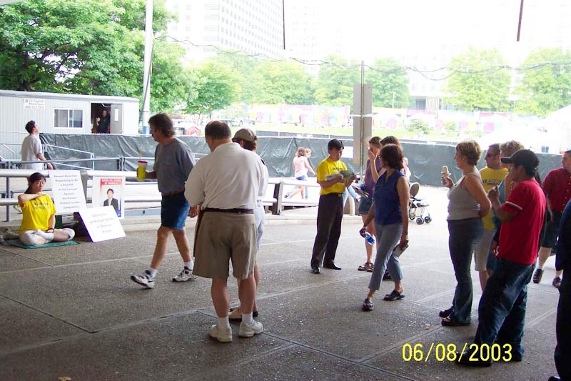 【明慧网2003年6月11日】2003年6月7日和8日下午,美国宾州匹兹堡市中心的坡恩州属公园(Point State Park)公园里熙熙攘攘、热闹非凡。人们正在这里举行一年一度、为期17天的艺术节。匹兹堡学员为了让更多的民众知道美国公民、法轮功学员李祥春医生绝食抗议中国江氏集团的非法关押和虐待,来到这里征集签名。很多路人都主动来询问、索取真相资料,纷纷在为营救李祥春的请愿信上签名,呼吁美国政府敦促中国政府立即释放李祥春。