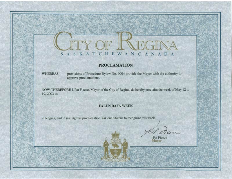 因此,我,帕特·菲雅克(Pat Fiacco),雷吉纳(Regina)市市长宣布2003年5月12日至19日为雷吉纳市