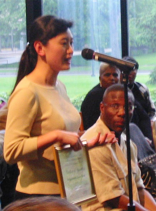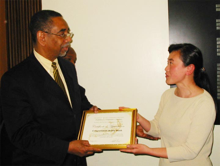 | 向马里兰州的易李库明施讲真相 | 向芝加哥联邦众议员丹尼戴维斯授予感谢状 |