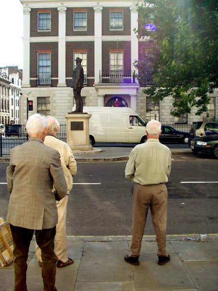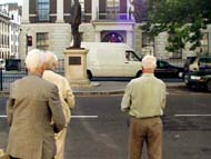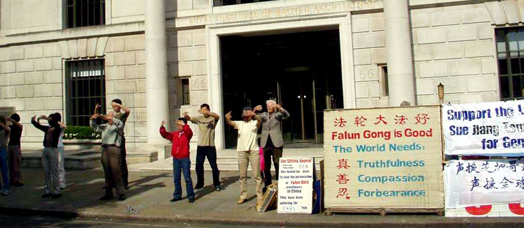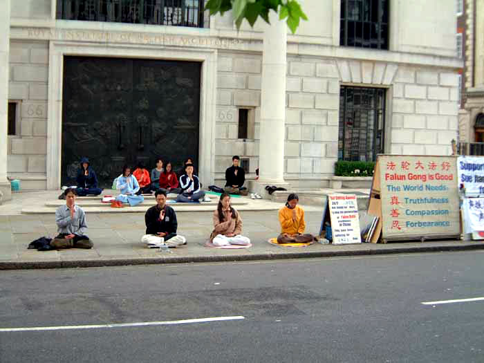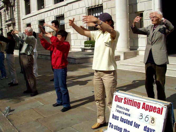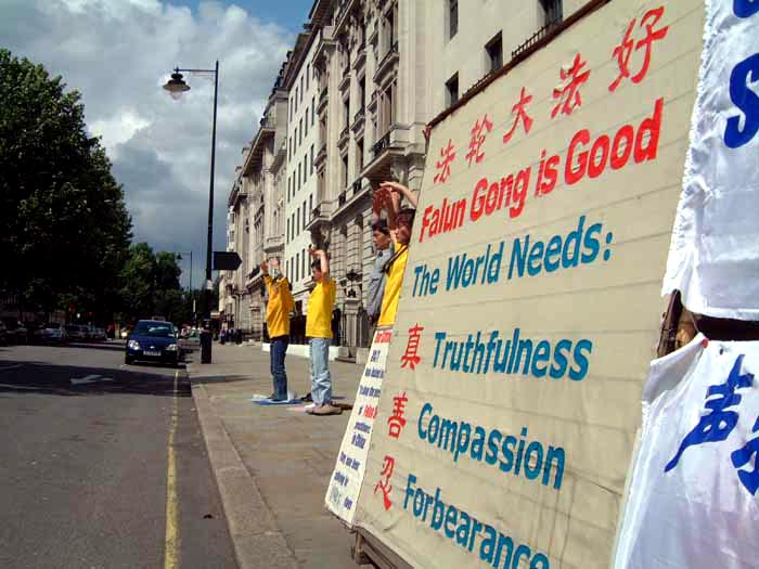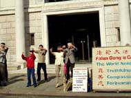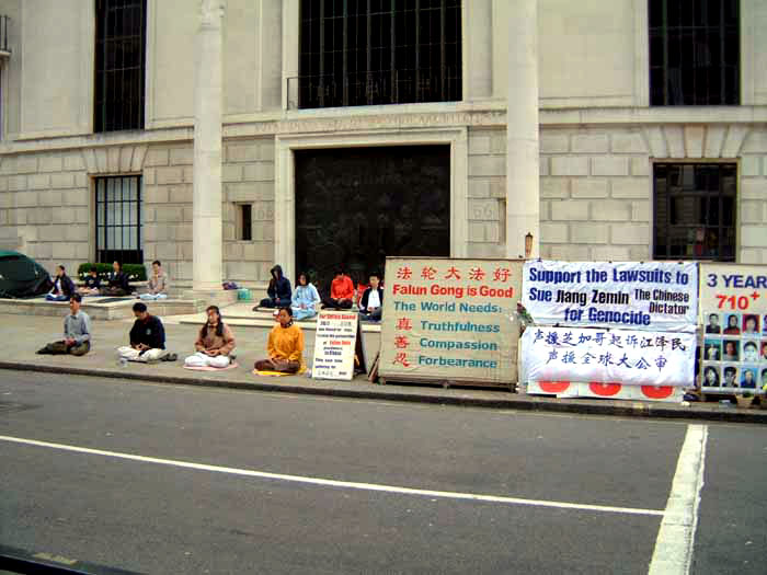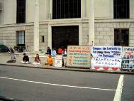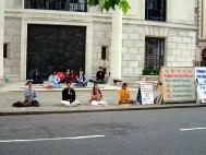 6月12日,为声援控告江泽民“群体灭绝罪”的诉讼案,部分伦敦的大法弟子再次到中使馆前炼功、整点发正念。