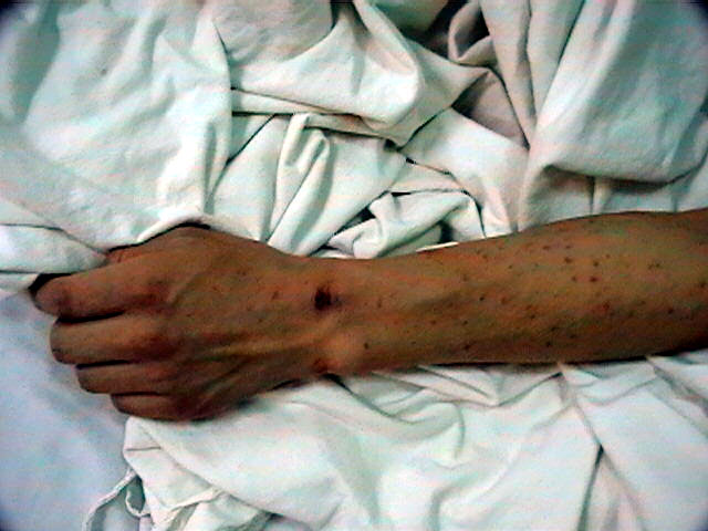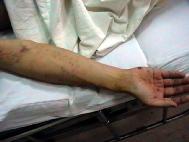 。照片中手腕上的疤是在洗脑班被邪恶之徒用手铐吊起来留下的。手臂上的点点是被邪恶之徒用手铐将他吊起来后喂蚊子,当时手腕上的肉都翻出来了,这是过了多少天后留下的疤痕。该学员家属已经将受迫害情况逐级、逐部门反映。