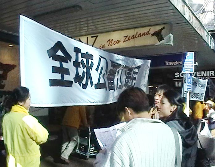 一位西人法轮功学员在游行前,首先向群众讲述了江××及610办公室镇压迫害法轮功已经四年了,而法轮功学员几年来一如既往地以平和、善良和理性的方式,向新西兰人民和海内外的中国人民讲清法轮功的真象。他表示,今天江××不但是迫害中国的法轮功学员,还将黑手伸向了海外,在新西兰,去年中国使馆干涉机场事务将法轮功海报取下就是一例。今天的集会,就是要揭露江××的“反人类罪行”,在这次中国的萨斯疫情中,他故意隐瞒事实,使得世界许多国家的人民受到无辜伤害。在迫害法轮功上他同样是故意隐瞒事实。他呼吁新西兰的善良人民支持法轮功学员起诉江××。