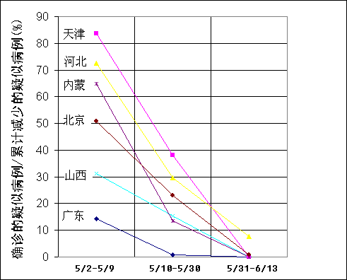 五月九日之后,疑似病例中确诊为SARS的数字急剧下降,广东从十五日起,天津从十七日起,疑似病例减少,没有一例是SARS,这就非常离奇。比较一下从五月二日到九日的数据,和九日之后的数据,这相当明显。二日之前的数据由于未报疑似病例确诊数据,无法比较。见图。
