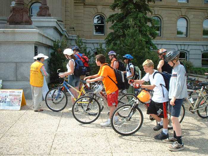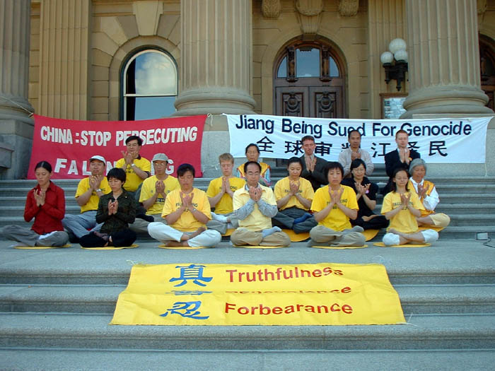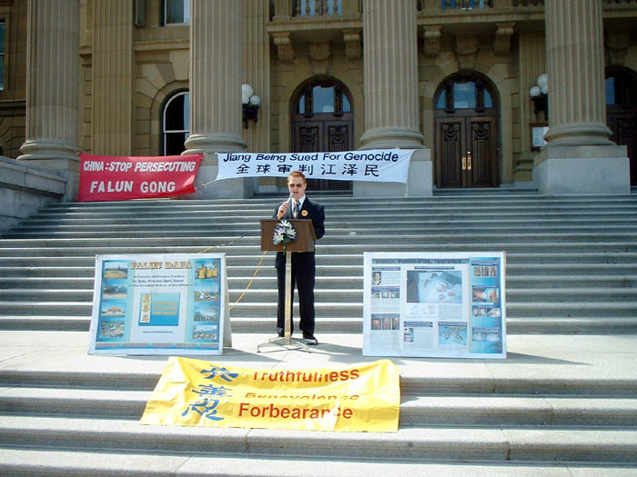 【明慧网2003年6月17日】6月14日,加拿大阿伯塔省法轮功学员为声援“全球公审江泽民”,营救学员李祥春等活动在省立法大楼前举行新闻发布会。来自埃德蒙顿和卡加利的学员参加了这次发布会。立法大厦前挂上了“全球审判江泽民”的横幅,一幅幅展板展示着江氏政治流氓集团疯狂迫害法轮功的罪证图片,电视机里滚动播放着有关诉江案的情况。