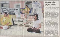【明慧网2003年6月17日】6月14日,德国卡姆市部分法轮功学员走上街头,向民众洪法、讲真象。国际人权组织的瑞姆( Römer)先生早早赶到支持我们的活动。烈日炎炎,他不辞辛劳,为营救熊伟和控告江XX积极征签,让一些乘凉休息的学员自叹不如。当地报社的记者前来作了采访。
