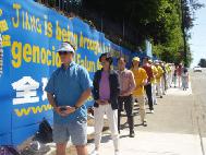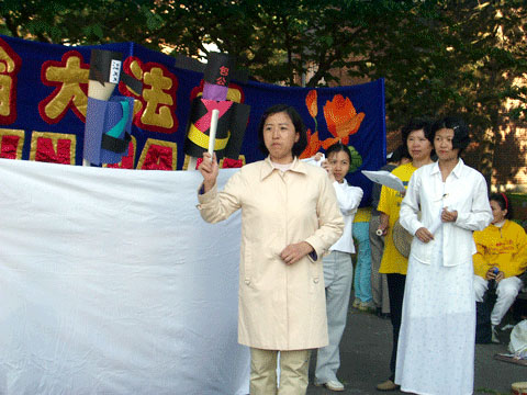 其他法轮功学员举着标语,或是散发传单,又请过往行人签名,在演出空档中,则有学员描述大陆受迫害学员的故事。