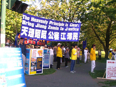 6月15日上午10点到下午4点在市中心艺术馆前摆展板、举大型横幅、炼功、征签、发传单。除“法轮大法好”、“真、善、忍”的中英文横幅外,还有“天理昭昭 公审江泽民”“法网恢恢 清算江泽民”两条大横幅。为了赶制横幅和展板,好些学员熬了好几个夜,第二天又照样参加活动。