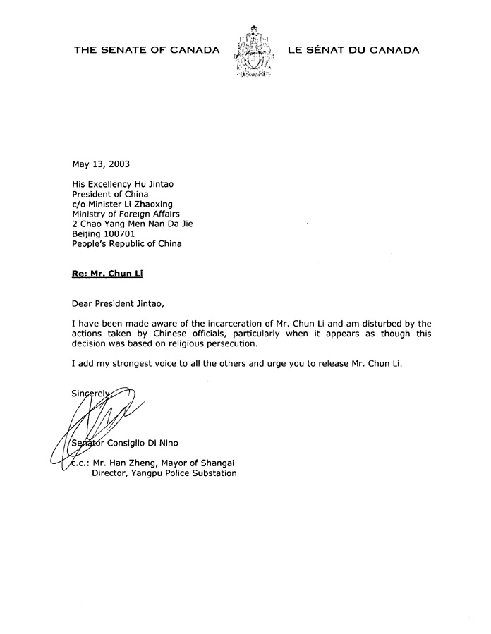 我和其他有关官员一起发出最强烈的要求,并强烈督促您释放李纯先生。
