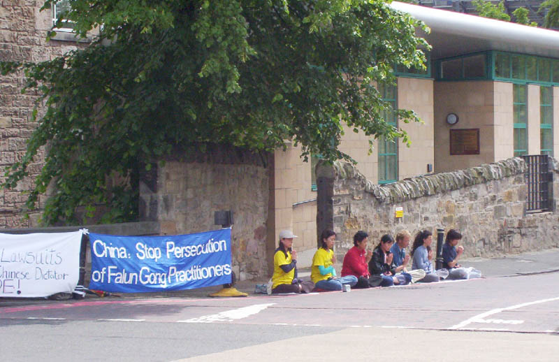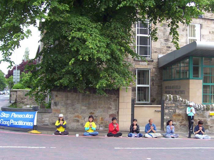 【明慧网2003年6月18日】6月15日星期日,苏格兰学员将两周一次的集体学法移至爱丁堡中领馆前,大家集体炼功、学法、整点发正念,声援“全球公审江XX”的活动。不断的有驶过的车辆鸣笛支持,其中有两位女士走下车来对我们说,每天早上都看见我们在这里炼功,今天特意下车向我们表示支持。