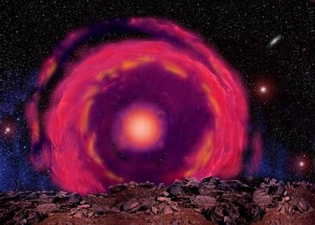 据悉,俄罗斯太阳地球物理学院西伯利亚分院将超新星爆发对附近行星的灾难性影响作了图像资料模拟演示:超新星爆炸后约8分钟,整个星空淹没在巨大而可怕的耀斑之中。接下来,与爆炸发出的使人目眩的光芒一起到来的是看不见的X射线、紫外线和辐射,它们冲破行星的大气保护层,瞬间就会毁灭所有生物。爆炸的辐射能量使大气层和行星表面的温度一下子加热到几千华氏度。海水开始大量蒸发。行星被灼热的气体笼罩。透过浓雾,一只膨胀的球体在闪闪发光,夜色苍穹红里透紫,整个场面十分可怕。