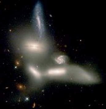 4个星系相互之间如此靠近,引力已经开始使它们的形状发生畸变,致使它们之间的恒星重新分布,这种“跳舞”已经持续了几十亿年之久,不可避免地导致形成一个大星系取代“六重奏”的4个星系,但是这种取代不会马上发生,多半需要经过几十亿年。
