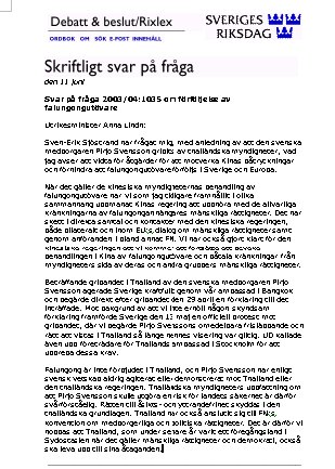 斯万.艾利克就瑞典公民普瑞佑.斯文森被泰国政府关押一事向我提出问题,即我应当采取哪些措施防止来自中国的压力并阻止对法轮功学员的迫害扩散到瑞典及欧洲。