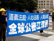 | 在华盛顿DC自由广场上上演在道德法庭公审江××的布偶戏 | 道德法庭法官宣布江××有罪 |