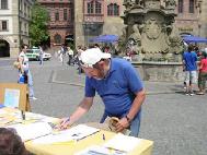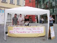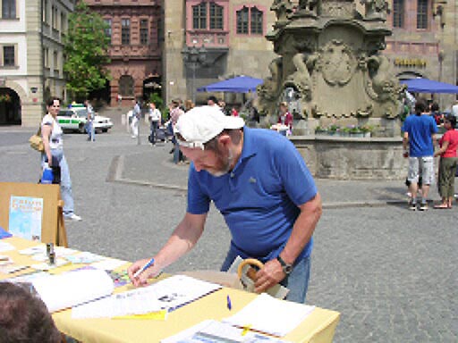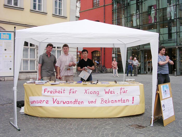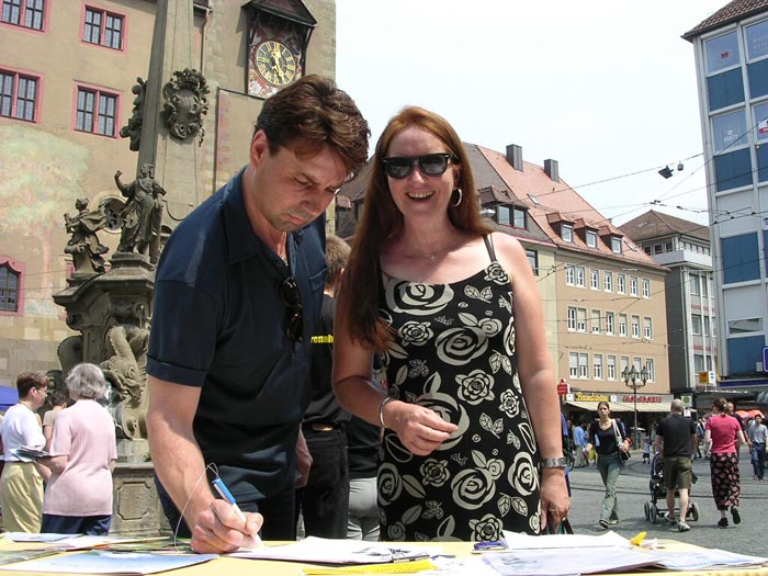 【明慧网2003年6月2日】一年一度的非洲节在德国南部名城符尔兹堡举行。许许多多的游客从各地涌来。我们以“释放熊伟及我们在中国的亲朋好友们!”为主题,展开了连续四周的营救征签活动。这是我们第一次以营救亲人为主题展开的征签活动。