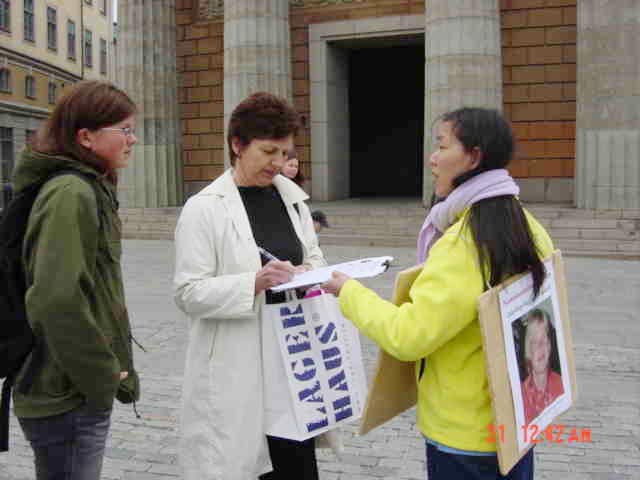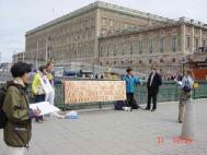 【明慧网2003年6月2日】为呼吁全社会关注仍在泰国被无理关押的法轮功学员普瑞佑·斯文森女士,瑞典斯德哥尔摩大法弟子连续开展征签活动。并以此活动揭露江氏集团