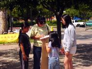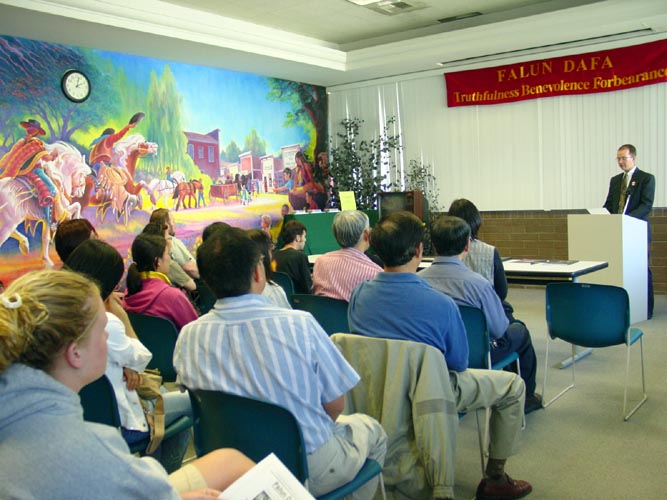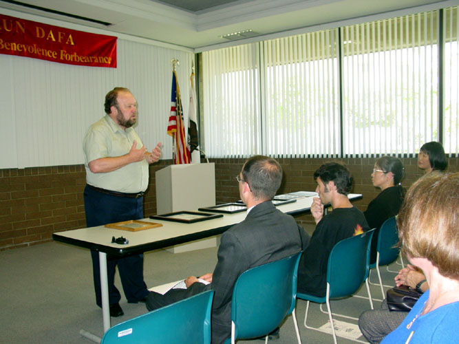 当地法轮功学员发言对刘易斯市长和其他圣地亚哥县的各级政府官员们表示了衷心的感谢,并向与会观众介绍了中国政府迫害法轮功学员的情况。该学员尤其谈及了为了抗议中国政府的非法判刑和拘禁已经绝食六天的李祥春医生的情况,并呼吁圣地亚哥县人民同法轮功学员一道,紧急行动起来,营救李祥春医生。