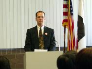 | 加州艾尔克航市庆祝首届“东圣地亚哥县法轮大法周” | 法轮功学员代表致开幕词 | 马克.刘易斯市长为庆祝活动做主旨发言 |