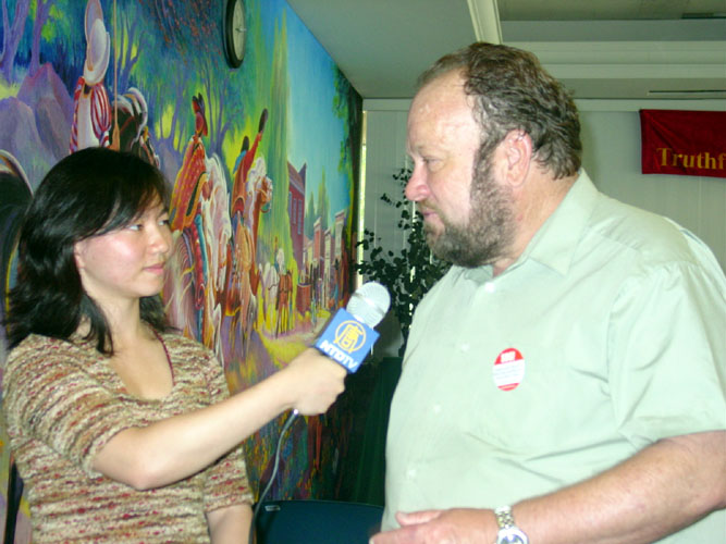 | 新!唐!人:记者采访刘易斯市长 | 前来参加庆典仪式的当地市民学习法轮功功法 | 图书馆外当地市民积极签字声援营救李祥春 |
