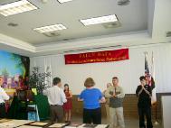 然后,全体与会者一同共同观看了介绍法轮大法的录像片。刘易斯市长接受了新!唐!人:电视台的专门采访,并和法轮功学员合影留念。参加庆祝仪式的当地市民学习了法轮功功法。