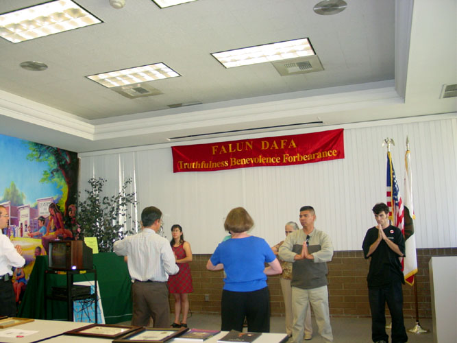 庆祝仪式的会场布置得庄严而祥和。主席台正前方悬挂着“法轮大法”和“真善忍”的横幅。在会场前排的桌子上,整齐地摆放着来自圣地亚哥县的各级政府官员为这次庆祝活动所颁发的褒奖状和嘉奖令等。在会场的四周摆放着各类介绍法轮大法和讲清真相的资料及紧急营救被中国政府非法关押和判刑的美国法轮功学员李祥春医生的展板。