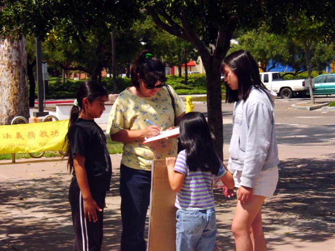 在举行庆祝仪式的同时,一些学员在图书馆内和四周进行了紧急营救李祥春的签名活动。许多善良的美国人民在听到正在绝食中的李祥春的情况后,对中国政府的野蛮行为表示极大的愤慨和不满,并毫不犹豫地签下了自己的名字。一位中学生不但自己签了名,还要求其母亲和妹妹也签了名;并且自己花钱在图书馆复印了四份签名信,然后让同她一起在图书馆学习功课的四位同学签了名,最后将签名信送回给学员。看到如此众多的善良的美国政府官员和美国人民对大法的深刻理解和真心支持,学员们的内心非常感动,他们向每一位签名人士表示深深的谢意。