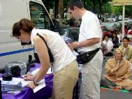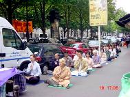 学员心里笑了:一定是这个标语牌打到了邪恶的神经要害;怎么使馆的人不敢要求拿掉那些有关法轮大法洪传世界、法轮功学员在中国大陆遭虐杀、酷刑的图板呢?是不是意味着他们承认这一切呢?