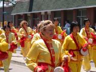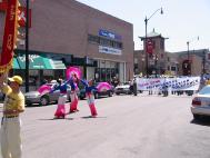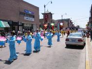 游行队伍由腰鼓、唐装,秧歌,绸子舞队等开路,约有一千多名学员参加。腰鼓队的学员充满豪情,绸子舞、仙女舞学员手提花篮翩翩起舞,轻盈飘逸,游行的学员们神态慈善平和,给过往行人和附近商家的员工送去了来自大法弟子们的美好祝愿。