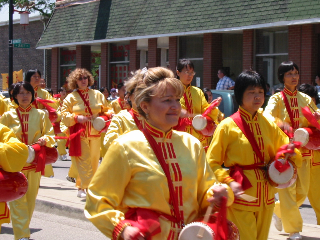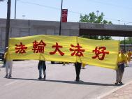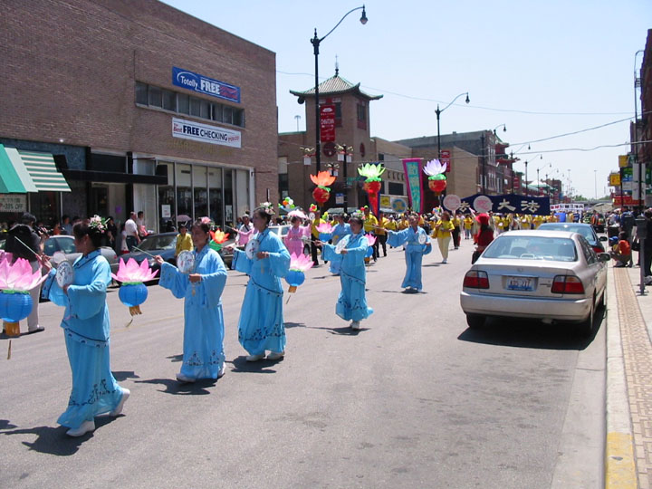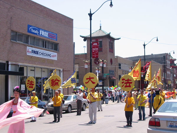 新闻发布会后,1500余名法轮功学员从联邦广场出发,开始了在芝加哥市中心的大游行。三位西人学员打着“法轮大法好”、“真善忍”的横幅走在队伍的最前列,紧随其后的紧急营救亲人的展板和横幅,接下来是150名身着白衣的女学员手捧着在中国被迫害致死的法轮功学员的照片,在悲壮的大法音乐《普度》、《济世》声中,场面庄严、肃穆、感人。
