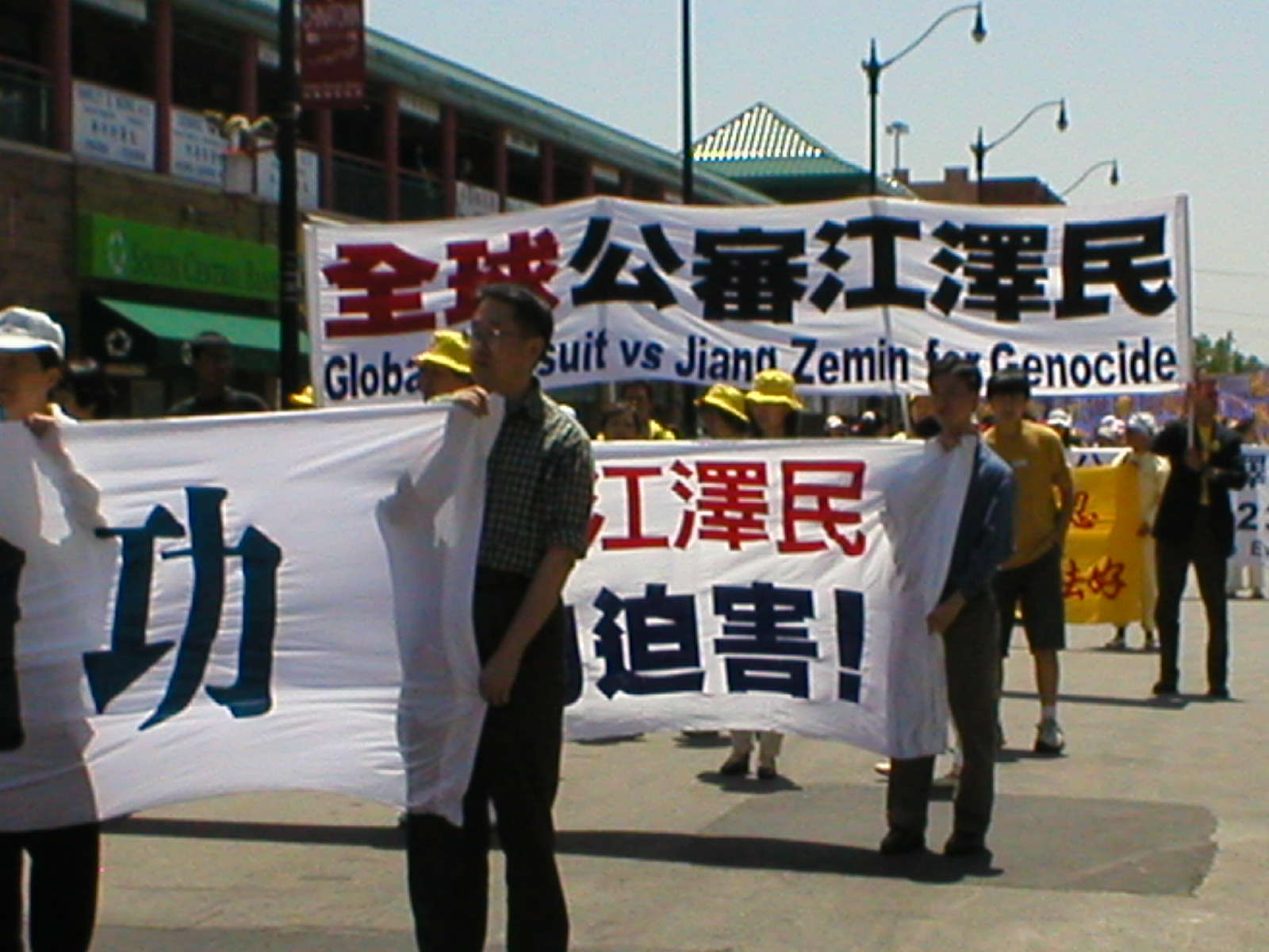 在游行队伍中人们可以看到一些巨大的横幅。有的写着:“法轮大法好”, “请伸出援手支持法轮功”,“全球公审江泽民”等。透过这些看似平凡的字眼,关心法轮功的朋友们可以看到许多的内涵。