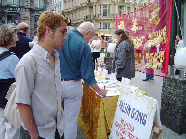 【明慧网2003年6月22日】奥地利大法弟子于2003年6月19至22日在维也纳举行了一系列活动支持公审江××。我们在中使馆前炼功、发正念,并在市中心向人们揭露江犯下的群体灭绝的罪行。