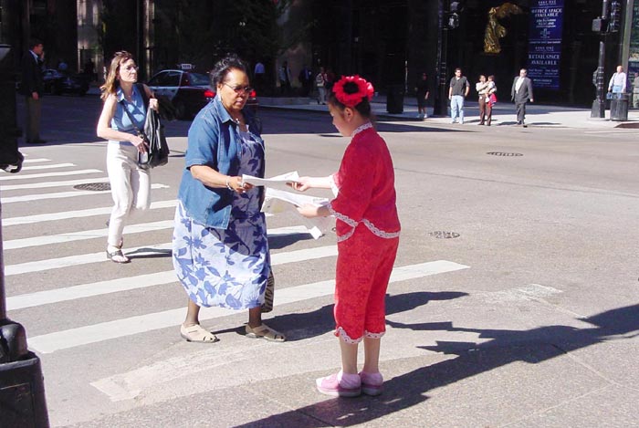 ◇学员在给一个华人女工发传单,邀请她来观赏周末的文艺表演和法轮功游行,并且让她带她的亲友一起来,她说:“那你多给我一些传单吧,我给那些跟我一起干活的工友。”