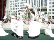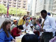 一位年轻人说,他非常敬佩法轮功学员的精神,把如此美好的东西奉献给社区。他还感谢学员们把在中国迫害法轮功的消息传播到美国社会,使更多人知道这场可怕的迫害。一位男士听完二胡演奏后,连声称赞“真是令人惊叹,真是令人惊叹!”,并说希望我们的活动能够对停止在中国的镇压有所帮助。当DC学员身着典雅华丽的唐装表演功法时,发资料的学员趁机给纷纷驻足的路人介绍功法。人们纷纷索取资料,有人说他有3位中国朋友,他要给他们也拿一些资料。一对夫妇跟学员长时间交谈,学员讲述了诉江案、美国公民查尔斯李在中国被非法关押,以及江氏集团将迫害延伸到海外等,他们对迫害感到震惊和愤慨。夫妇俩同时又为学员们优雅平和的功法演示所吸引,准备找炼功点开始学功。一位学员说看到那么多善良的人高兴地拿到真相资料,她的眼中噙满泪水。值得一提的是,一位湖南来的老大爷一直在看我们的表演。开始学员问,他摇着手,避之不及。但观看了一会表演之后,学员又徐徐地给他正面介绍大法,告诉他法轮功真善忍的信仰,是教人作好人的。配合着柔和的音乐,老大爷听得连连点头。