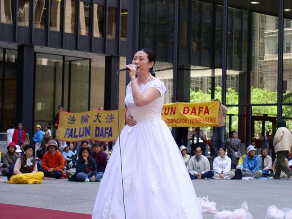 其中有一些年逾花甲的老人,他们也是乘长途车通宵赶往这里。人们安静地炼习法轮功五套功法,向人们展示法轮功学员不屈服的毅力。中国驻芝加哥领事馆前面和左右的街巷道周围坐满了法轮功学员。领馆的正对门,挂着巨幅海报,上面是四年来被无辜虐死的一些中国法轮功学员的照片。法轮功学员打出巨幅“全球公审江泽民”、“把江泽民送上法庭”、“停止镇压法轮功”等巨幅横幅,场面壮观肃穆,芝加哥市民说:“这样的场面,近百年都不曾看见。”法轮功学员给芝加哥市民派发了大量传单,芝加哥的气氛和焦点话题都在谈论“起诉江泽民”。