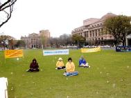 整个活动中,阴风阵阵,阴雨濛濛,学员们始终安静祥和地坐在湿漉漉的草地上,不停地发正念和展示功法,过往的行人都为之动容,有的主动在征签表上签名,有的双手合十连声向学员道谢。一位台湾人感叹地说:“这么大的风,这么大的雨,你们都不动,真伟大!太了不起了!我回台湾就买一本《转法轮》。”