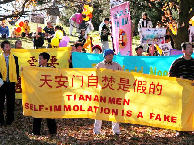 中午12点,游行队伍来到了堪培拉市中心。雨中的格力玛(Garema) 广场聚集了游行的人群和当地市民几百人,并观看了一场公审江泽民的模拟表演(mock trial)。演出中,“江泽民”被推上了正义法庭,四位证人分别出庭作证。