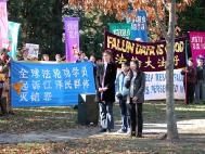 游行队伍中学员们高举许多中英文横幅,包括,“法轮大法好” 、“真善忍” 、“全球公审江泽民” 、“紧急营救受迫害的亲人” 、“停止对法轮功的迫害”等。他们还举着法轮大法在世界各地洪传和在中国受迫害的图片。长长的游行队伍,声势浩大,吸引着许多市民驻足观看。
