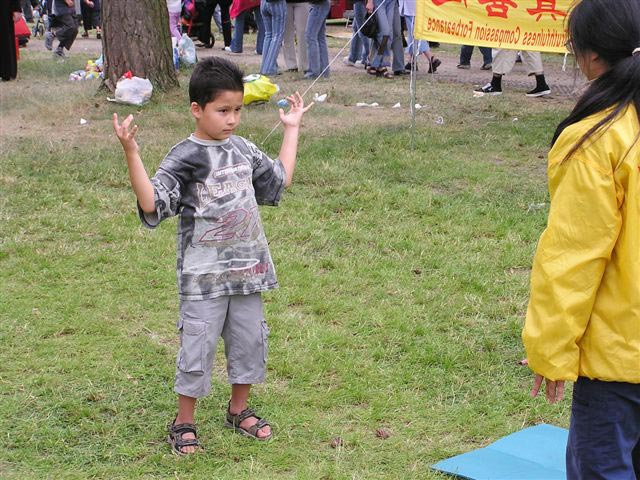 值得一提的是有两个11岁和7岁来自不同家庭的小朋友学功的故事。11岁的小朋友看到我们在那里炼功就跟我们认真地学了起来,五套功法学会后就跟我们一同炼。前后几个小时没有离开我们。而那个只有7岁的小朋友看到我们后就不走了,也跟学员聚精会神地学了起来。当这位小朋友的父亲看到他的孩子在跟我们一起双盘打坐,才松了一口气,说他已经找他很久了,并告诉我们这孩子在家里常常这样双盘打坐。听到这些学员心里都明白这孩子是来得法的。