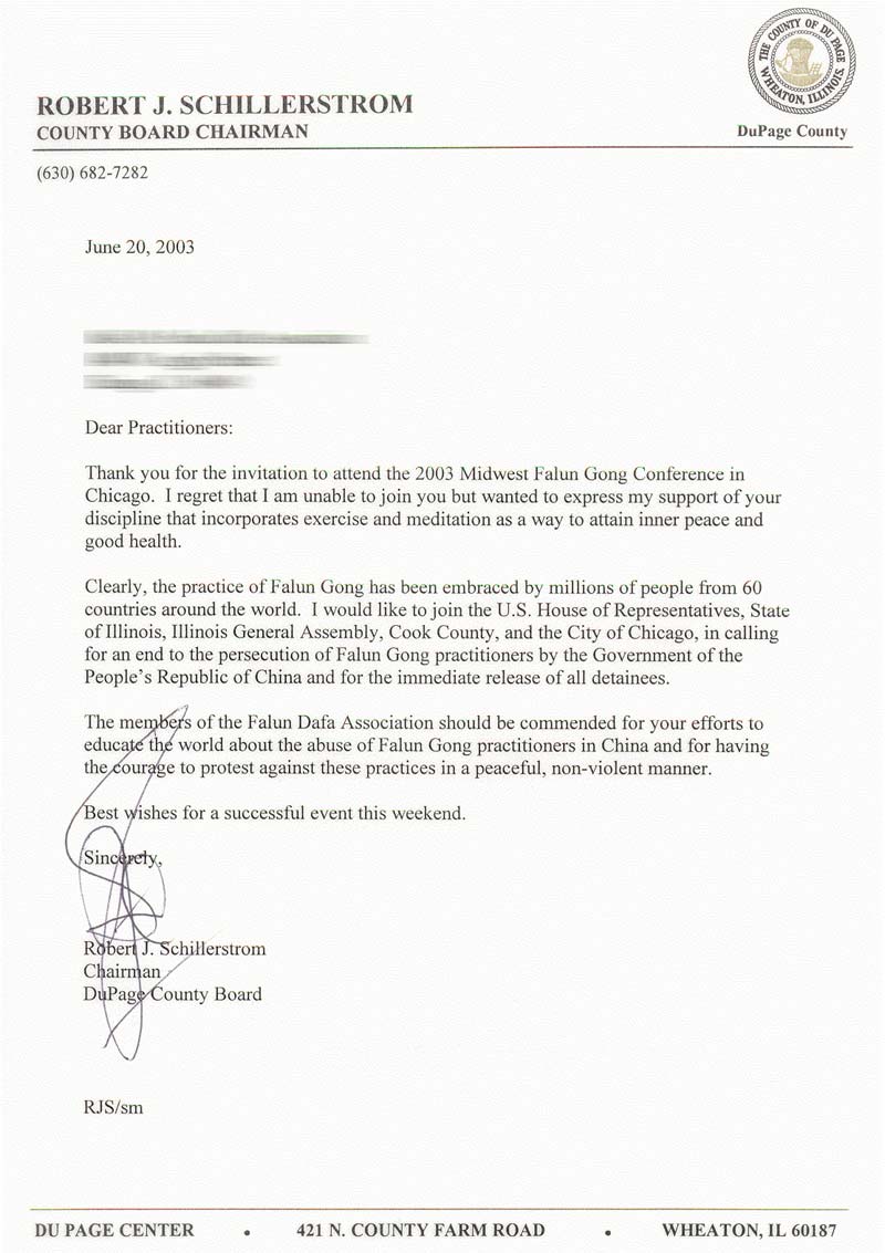 感谢你们邀请我参加在芝加哥举行的2003年美中法轮功心得交流会。我很遗憾无法参加你们的会议,但希望在此表达我对你们的功法的支持,贵功法结合了炼功与静修,并以此方式获得内心平静与健康。
