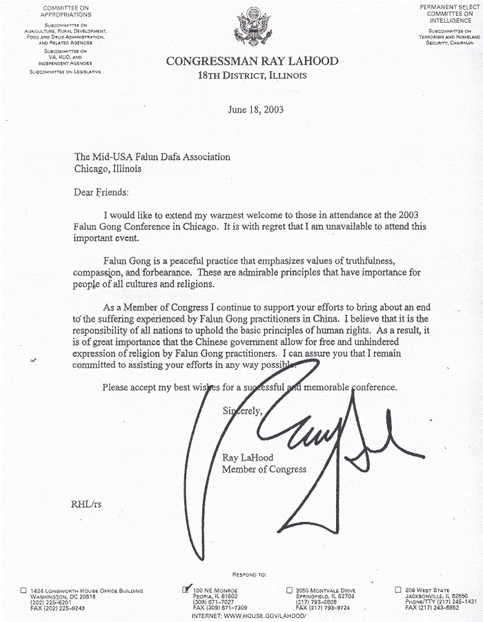 作为国会议员,我继续支持你们的努力以结束在中国的法轮功学员们所经受的痛苦。我认为维护这些基本人权原则是所有国家/民族的责任。最终,中国政府允许法轮功学员们自由而不受阻挠地表达他们的信仰,是具有极其重要的意义的。请相信,我将继续以一切可能的方式支持你们的努力。