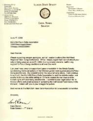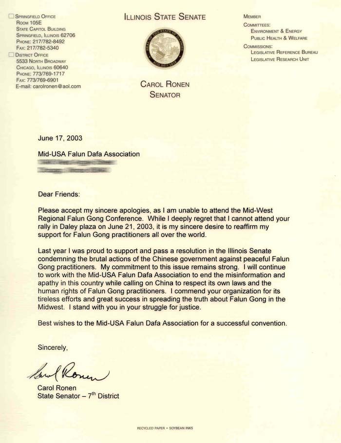 去年,我自豪地在伊利诺意州参议院支持并通过了一项谴责中国政府残酷镇压法轮功学员行动的决议。我仍然十分坚决地致力于这一问题。我将继续与美中法轮大法学会共同努力结束在本国的信息误导和漠不关心的状况,同时呼吁中国尊重其自己的法律和法轮功学员们的人权。我赞扬贵团体在美国中西部地区传播法轮功真相方面的不懈努力和伟大成功。在你们为争取公义而进行的斗争中,我与你们站在一起。