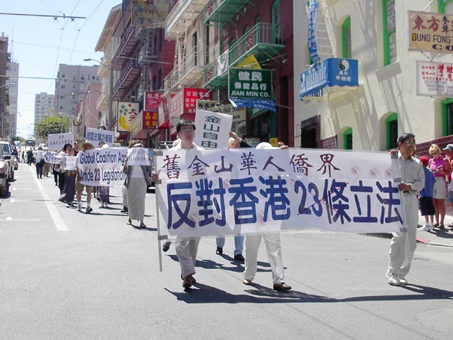 各界代表发言结束后,湾区的法轮功学员们以及与会者举行了游行,旨在呼吁社会各界关注香港未来的命运。他们举着“反对香港23条立法”,“捍卫香港自由,勿向强权低头”等各式横幅穿过繁华的旧金山唐人街。游行吸引了许多的路人,人们纷纷从街道两边的店铺中走出来观看。