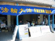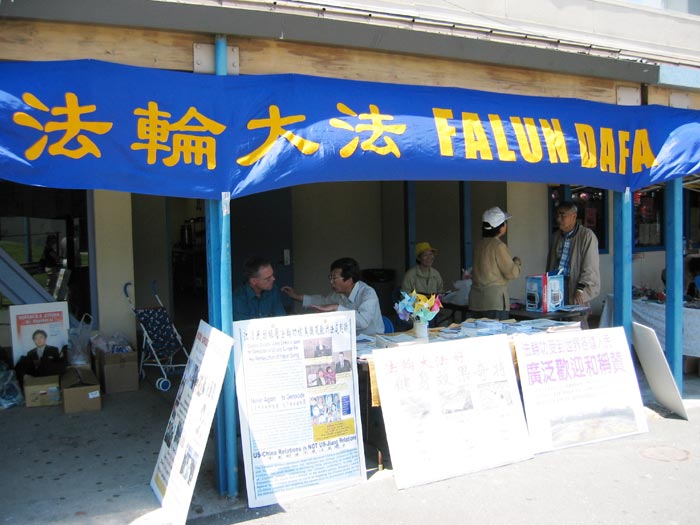法轮大法的展台位于中央地段,印有中英文字样的法轮大法横幅在灿烂的阳光中随风飘扬,熠熠生辉,格外引人注目。游客之中不时有中西观众前来观看展板和了解法轮功真象。学员们配合默契,有的发材料,有的与观众交谈,有的为小朋友做小风车。有观众表示想立即学功,学员就现场教功。