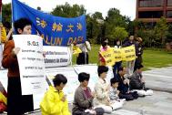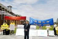 从昨天开始下的雨一直连绵不断,但这挡不住学员为营救被关押在国内的同修的决心。就在新闻发布会开始前一小时,太阳终于冲破了乌云,把光芒撒向了大地。过往游人惊诧于美国公民竟被中国政府非法关押,纷纷接过了真相材料。有的行人一直听到发布会结束,有的与学员交谈一个小时也不愿离开,很想学炼法轮功,并表示要写信给美国总统,国务院等,帮助一起呼吁释放美国公民李祥春。