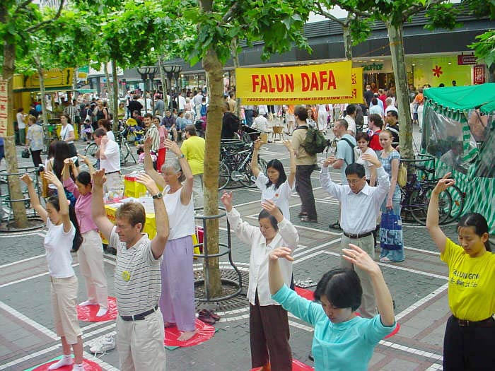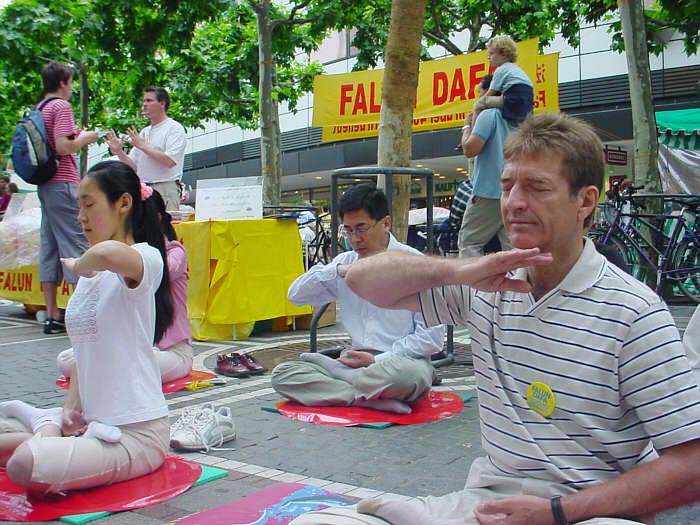 学员们于5月31日在法兰克福的最热闹的商业区展示功法。很多行人被这个安静的气氛深深吸引,站住了脚步。另一些人听学员讲解法轮功学员在中国遭受迫害的情况。还有一些在以前就亲身受过集权的政府的专制,或者见证了人权侵犯和集权政府头目的对权力的占有欲,很清楚这种迫害的残酷。一位年轻的女士来了好几次,并且马上学了功。