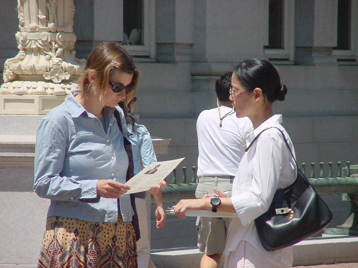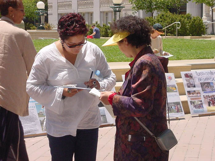 有两位白人观众走过来,用中文主动向我们招呼说:“你们好!”然后其中一个又说:“我就弄不明白,江××为什么要迫害你们这些好人?”有个学员回答说:“他怕好人多会威胁他!”他们说:“那他还是人吗?!……”最后,高兴地在征签板上签下了他们的名字,摆放了他们的位置。学员把控告江××、全球大审判的传单送给他们,然后招手告别。