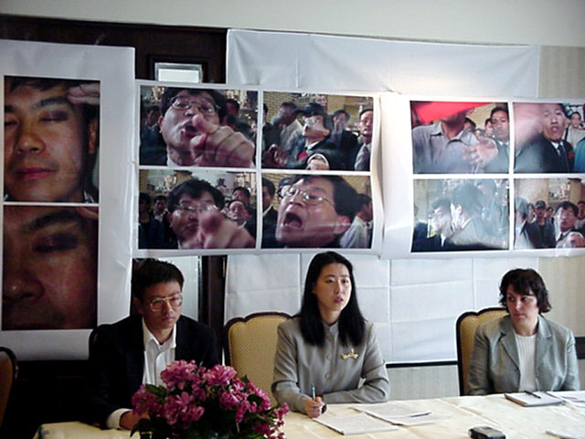 李其特表示,开宴会的人冲出来几十人围住他们,开始撕他们的传单,并且出手攻击他们。她同时在现场展示当晚拍摄到的放大照片,并播放一段某电视媒体拍摄的画面。