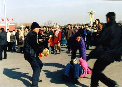 | 以梁冠军为首的一些人将多名法轮功学员打伤 | 花俊雄在谩骂 | 暴徒推搡法轮功学员 |